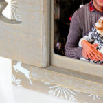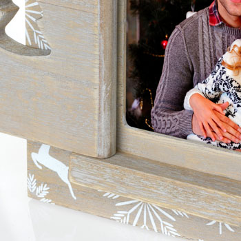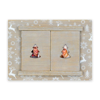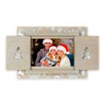 DESCRIPCIÓN Marco Tirolo A, de madera, color natural, con impresión en blanco y decoración perforada en forma de árbol, con puertas que se abren y cierran, en forma de ventana, temática invernal, de sobremesa, idea de regalo original, decoración navideña, regalo personalizado.