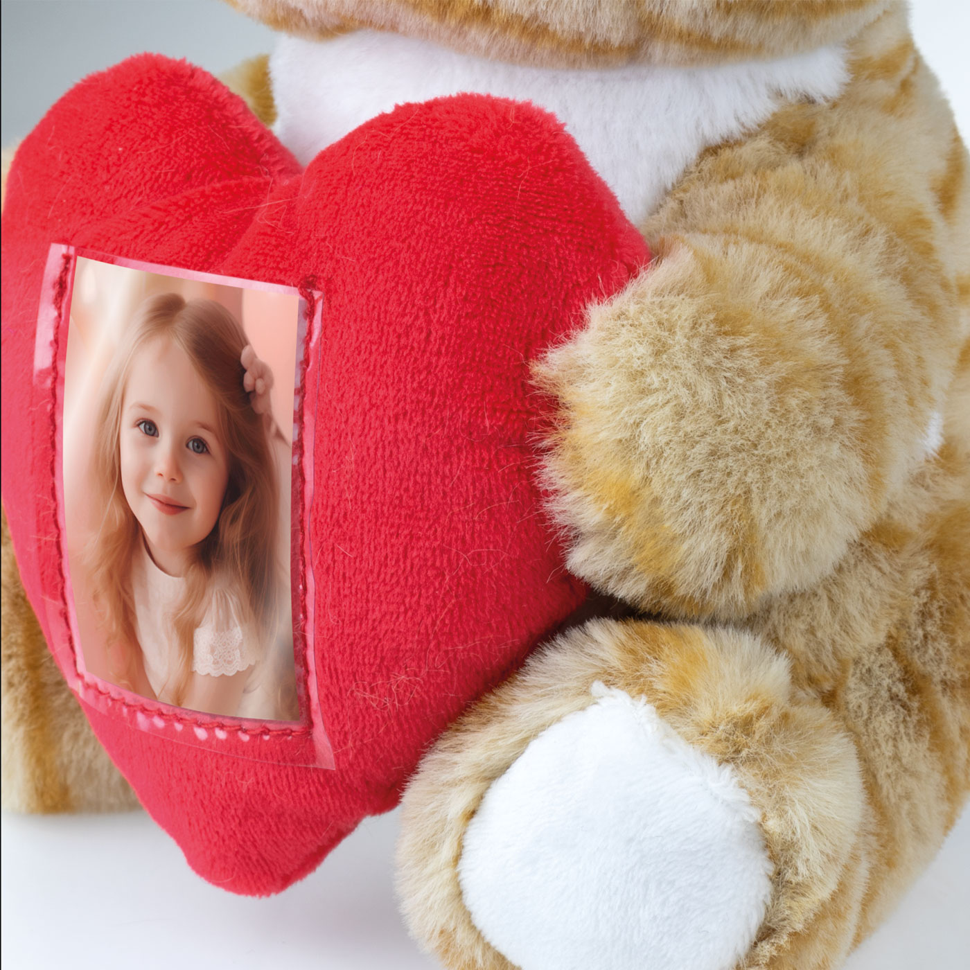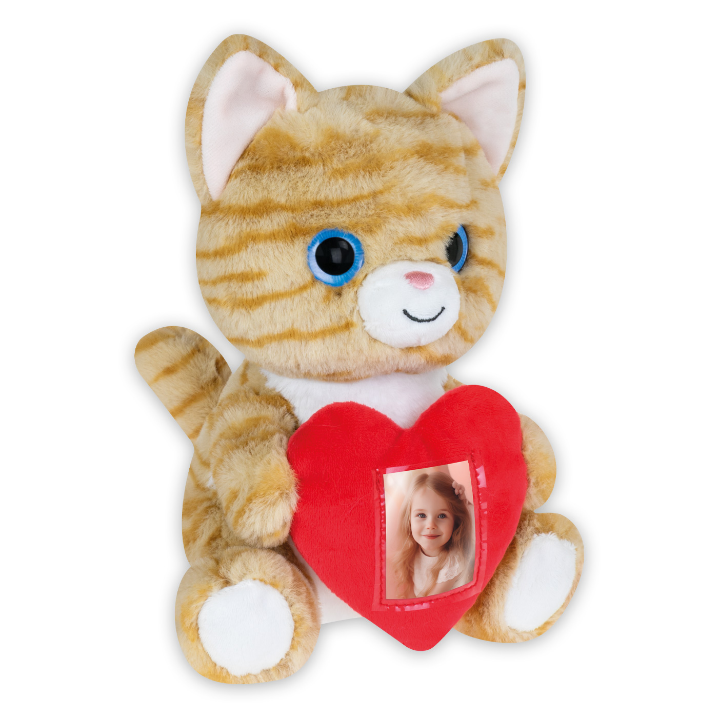 Peluche Photo Cat, suave gatito de peluche atigrado, color beige, con corazón rojo para foto, temática de amor, apto para el hogar y la oficina, idea de regalo original.
